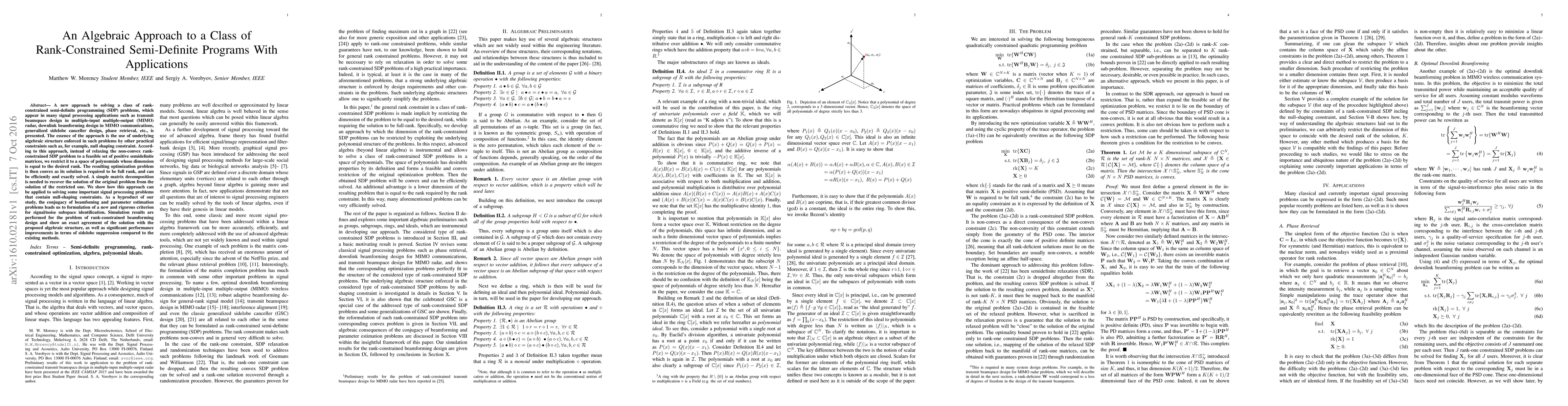 This paper introduces an algebraic approach to solve rank-constrained semi-definite programming problems, which are prevalent in signal processing applications like MIMO radar and communications. Instead of relaxing the non-convex problem, it restricts it to a polynomial space, resulting in a convex optimization that can be efficiently solved.