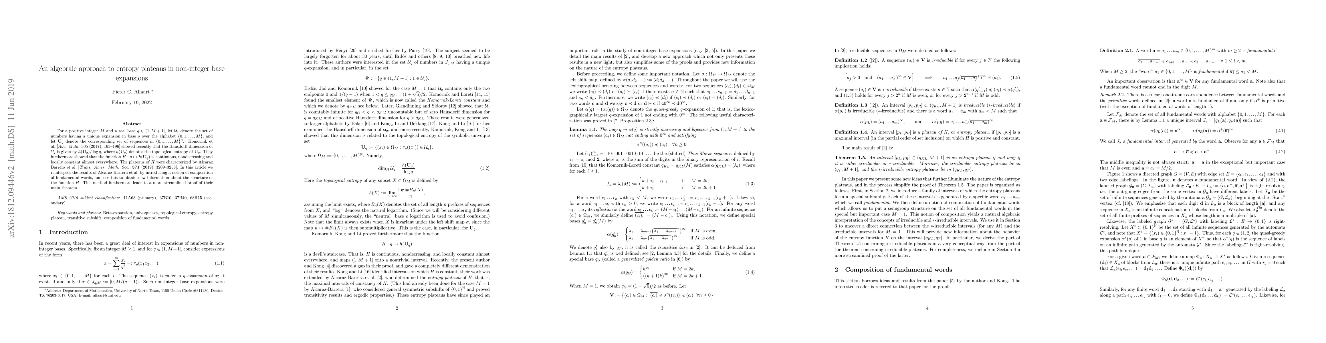This paper builds upon previous research on the Hausdorff dimension of sets in non-integer base expansions, introducing a new method using fundamental word composition. It provides new insights into the function H, which characterizes entropy plateaus, and offers a more streamlined proof of prior findings.