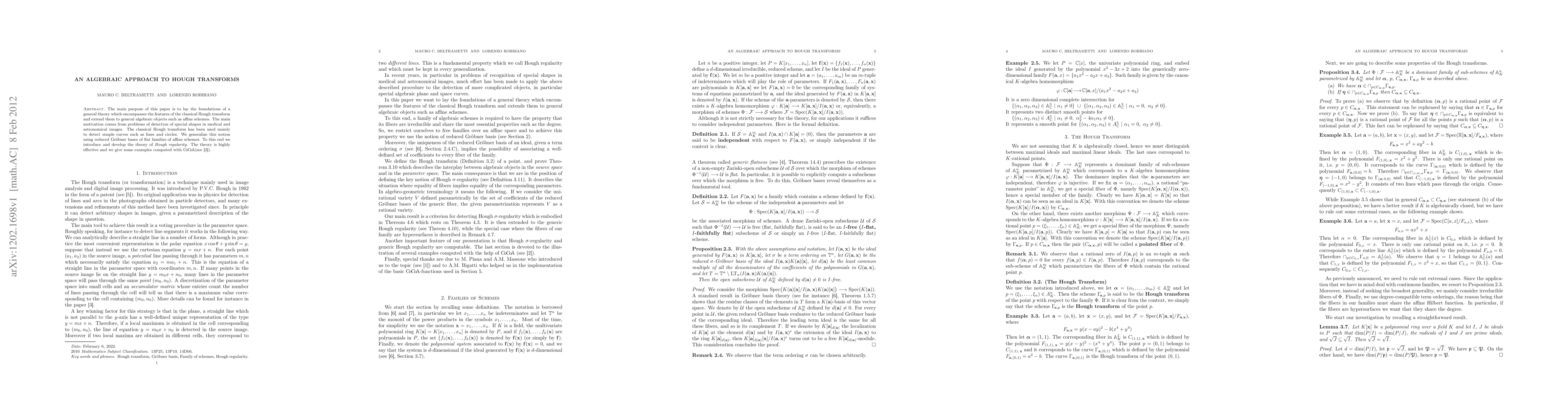 This paper develops a general algebraic theory extending the classical Hough transform to detect complex shapes in images, using reduced Groebner bases and Hough regularity, with applications in medical and astronomical image analysis. Examples of its effectiveness are demonstrated using the CoCoA software.