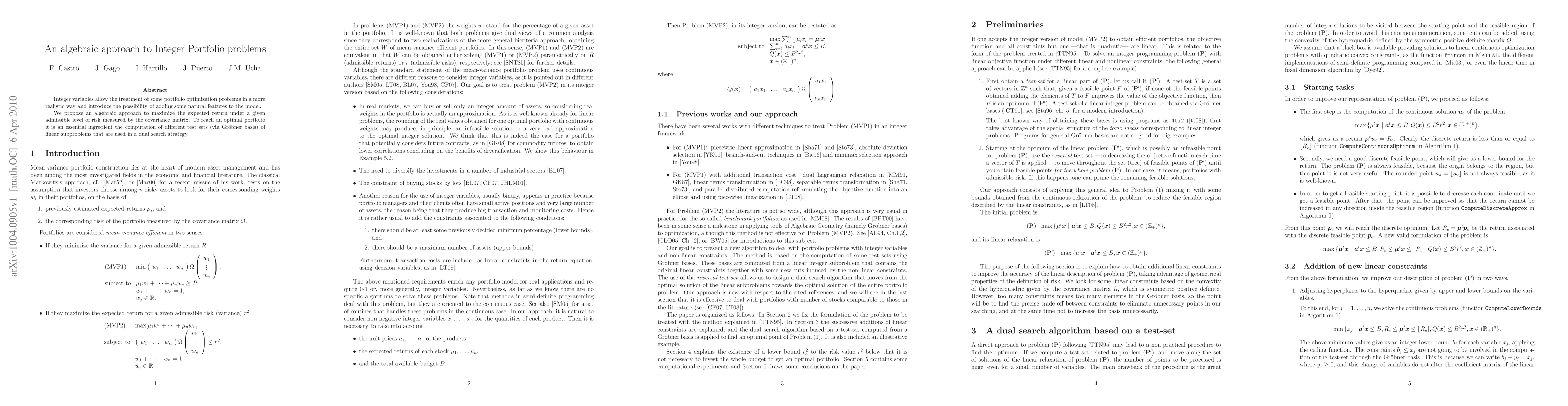 Integer variables allow the treatment of some portfolio optimization problems in a more realistic way and introduce the possibility of adding some natural features to the model. We propose an algebraic approach to maximize the expected return under a given admissible level of risk measured by the covariance matrix. To reach an optimal portfolio it is an essential ingredient the computation of different test sets (via Gr\"obner basis) of linear subproblems that are used in a dual search strategy.