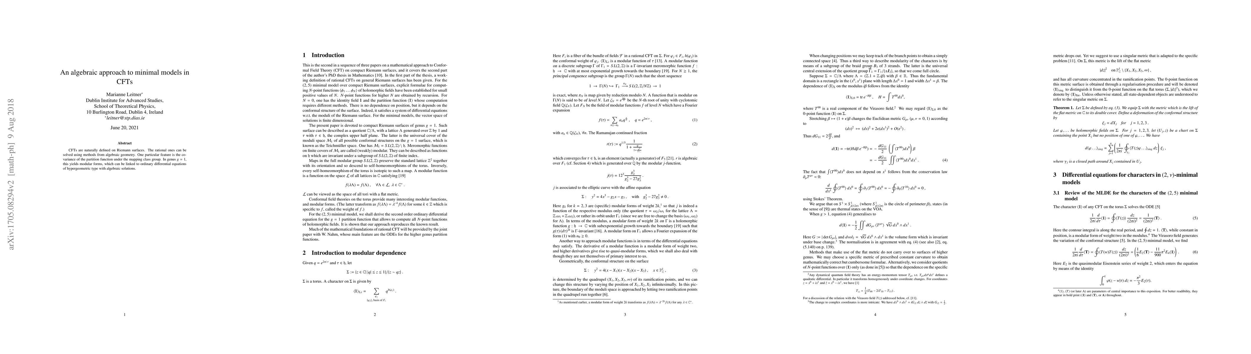 Researchers used algebraic geometry to solve minimal models in Conformal Field Theory (CFT), finding a link between CFTs on Riemann surfaces and hypergeometric differential equations with algebraic solutions.