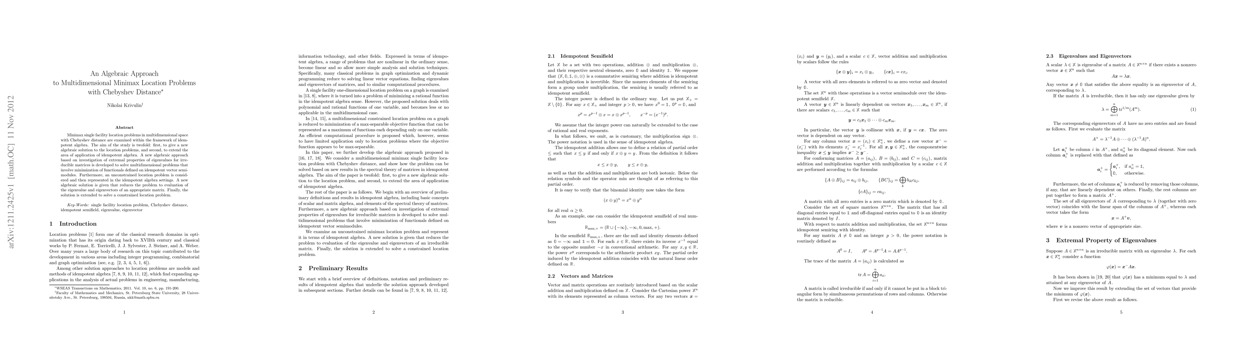 This paper presents an algebraic approach using idempotent algebra to solve multidimensional minimax location problems with Chebyshev distance. It develops a new method based on extremal properties of eigenvalues for irreducible matrices, and extends the application of idempotent algebra to both unconstrained and constrained location problems.