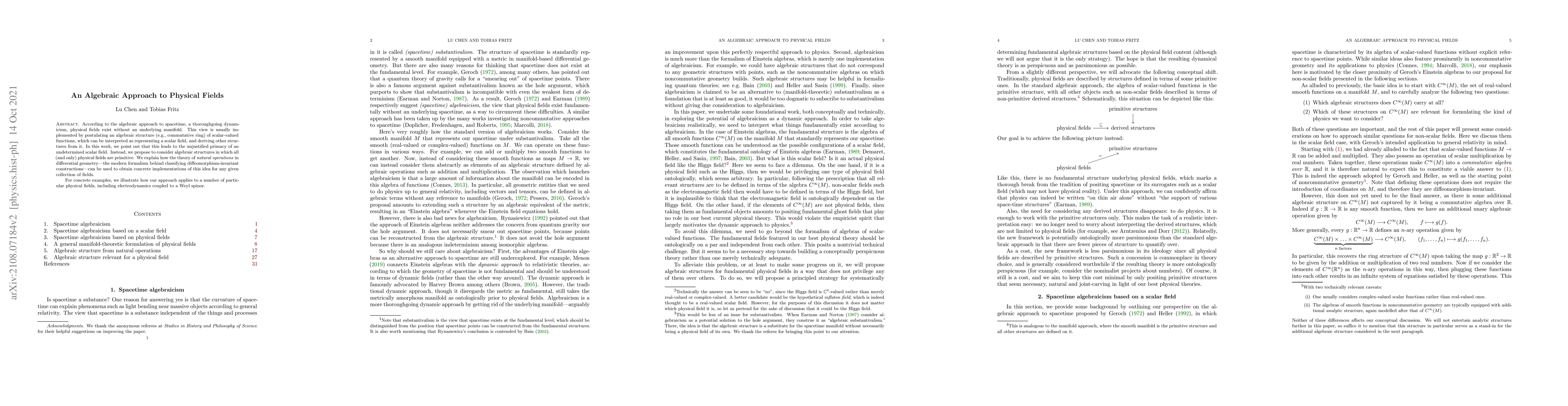 According to the algebraic approach to spacetime, a thoroughgoing dynamicism, physical fields exist without an underlying manifold. This view is usually implemented by postulating an algebraic structure (e.g., commutative ring) of scalar-valued functions, which can be interpreted as representing a scalar field, and deriving other structures from it. In this work, we point out that this leads to the unjustified primacy of an undetermined scalar field. Instead, we propose to consider algebraic structures in which all (and only) physical fields are primitive. We explain how the theory of \emph{natural operations} in differential geometry -- the modern formalism behind classifying diffeomorphism-invariant constructions -- can be used to obtain concrete implementations of this idea for any given collection of fields. For concrete examples, we illustrate how our approach applies to a number of particular physical fields, including electrodynamics coupled to a Weyl spinor.