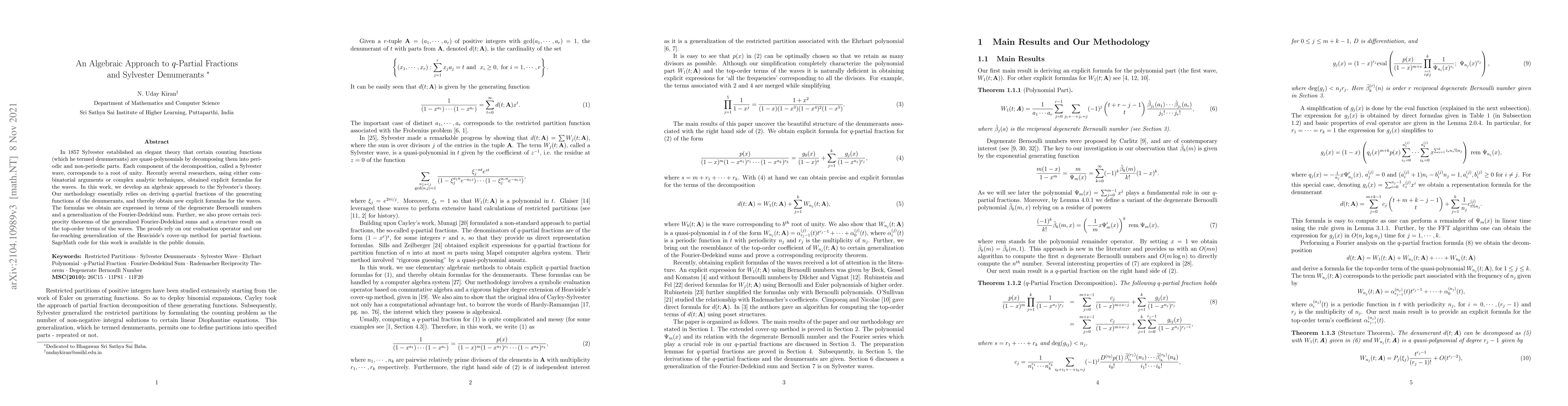 Researchers develop an algebraic approach to q-Partial Fractions and Sylvester Denumerants, providing new explicit formulas for the waves using degenerate Bernoulli numbers and a generalized Fourier-Dedekind sum.