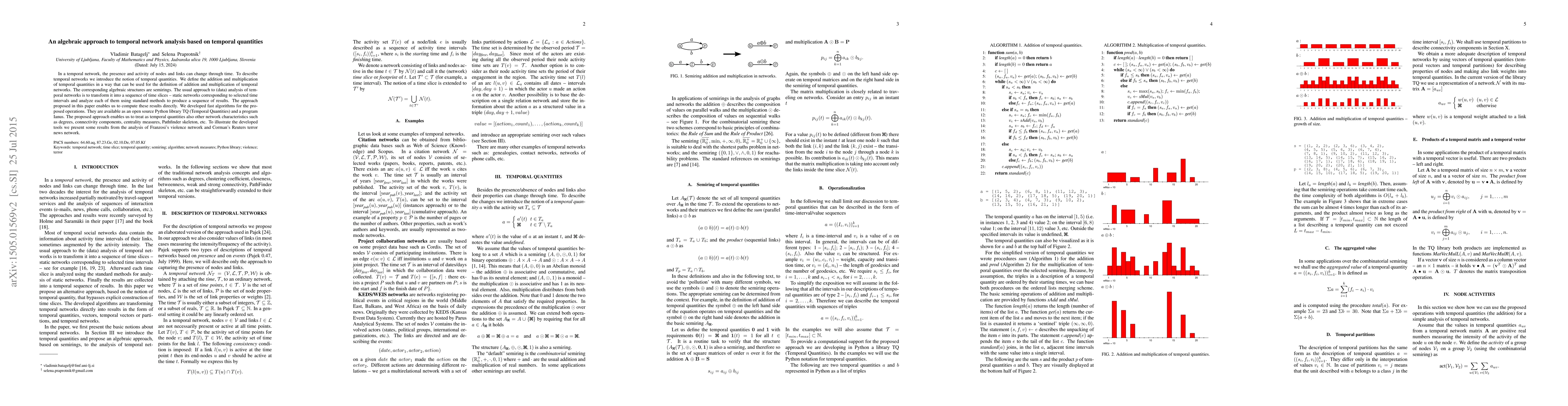This paper introduces an algebraic framework for analyzing temporal networks using temporal quantities, defining operations over these quantities within semiring structures. The proposed approach allows for direct computation of network characteristics without transforming networks into static slices, and it includes fast algorithms implemented in an open-source Python library and program.