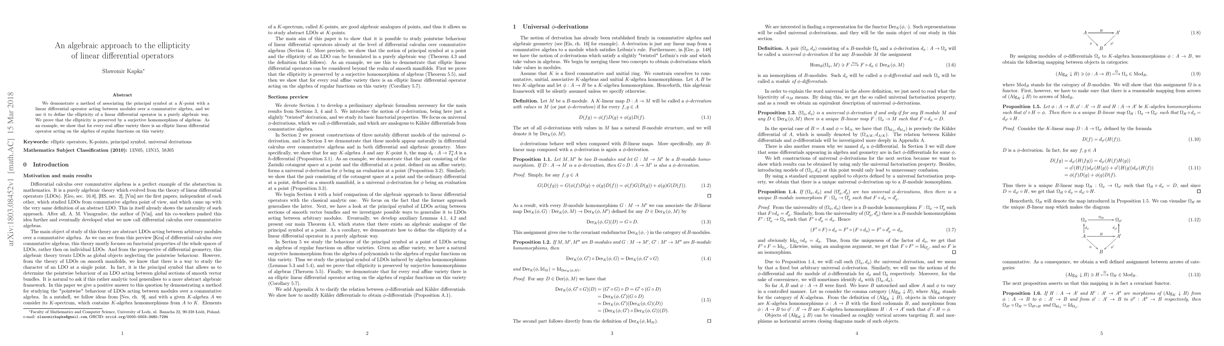 We demonstrate a method of associating the principal symbol at a $K$-point with a linear differential operator acting between modules over a commutative algebra, and we use it to define the ellipticity of a linear differential operator in a purely algebraic way. We prove that the ellipticity is preserved by a surjective homomorphism of algebras. As an example, we show that for every real affine variety there is an elliptic linear differential operator acting on the algebra of regular functions on this variety.