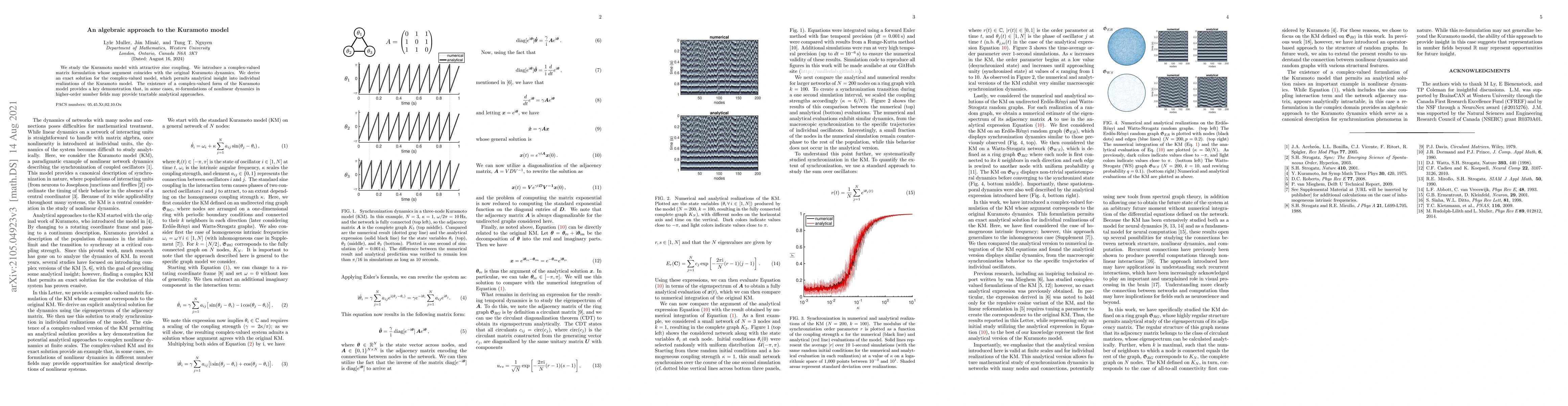 We study the Kuramoto model with attractive sine coupling. We introduce a complex-valued matrix formulation whose argument coincides with the original Kuramoto dynamics. We derive an exact solution for the complex-valued model, which permits analytical insight into individual realizations of the Kuramoto model. The existence of a complex-valued form of the Kuramoto model provides a key demonstration that, in some cases, re-formulations of nonlinear dynamics in higher-order number fields may provide tractable analytical approaches.