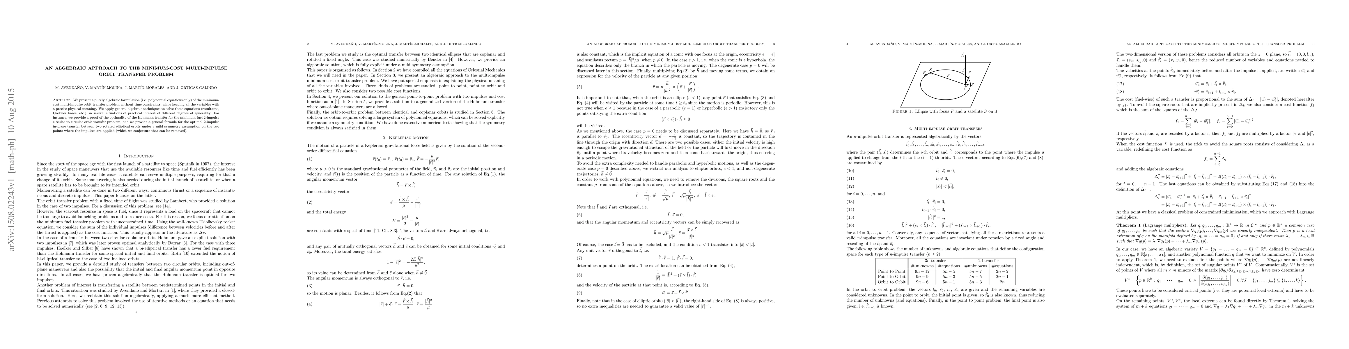 This paper formulates the minimum-cost multi-impulse orbit transfer problem purely algebraically, solving it using techniques like resultants and Gröbner bases. It proves the optimality of the Hohmann transfer for 2-impulse circular to circular orbit transfers and provides a general formula for optimal 2-impulse in-plane transfers between rotated elliptical orbits.