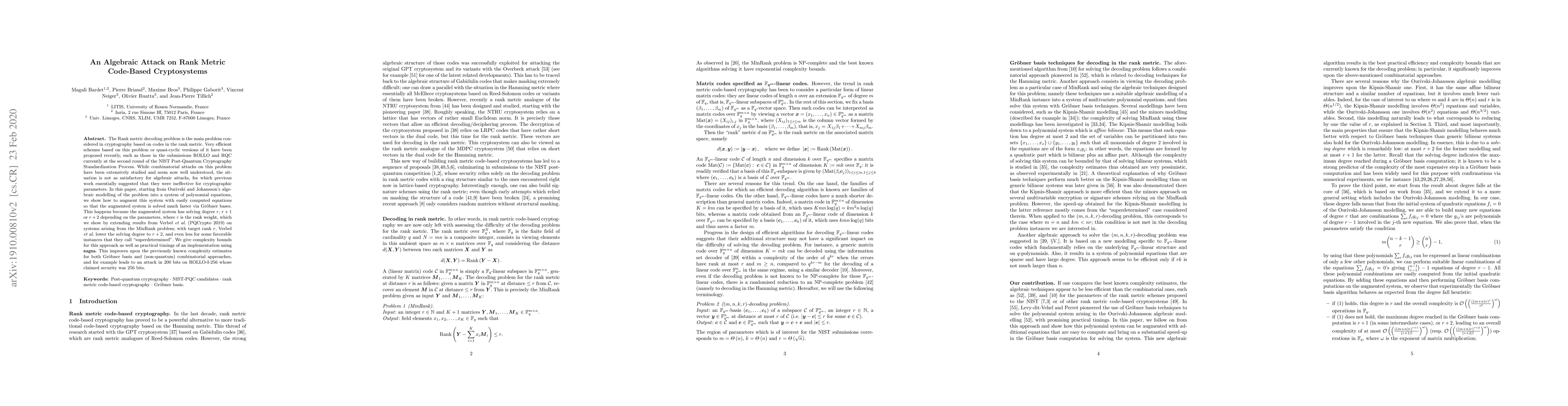 This paper presents an algebraic attack on rank metric code-based cryptosystems, improving the solution of the rank metric decoding problem via Groebner bases. The authors augment the algebraic system with additional equations to lower the solving degree, achieving a more efficient attack than previous methods, demonstrated with practical timings and an example attack on ROLLO-I-256.