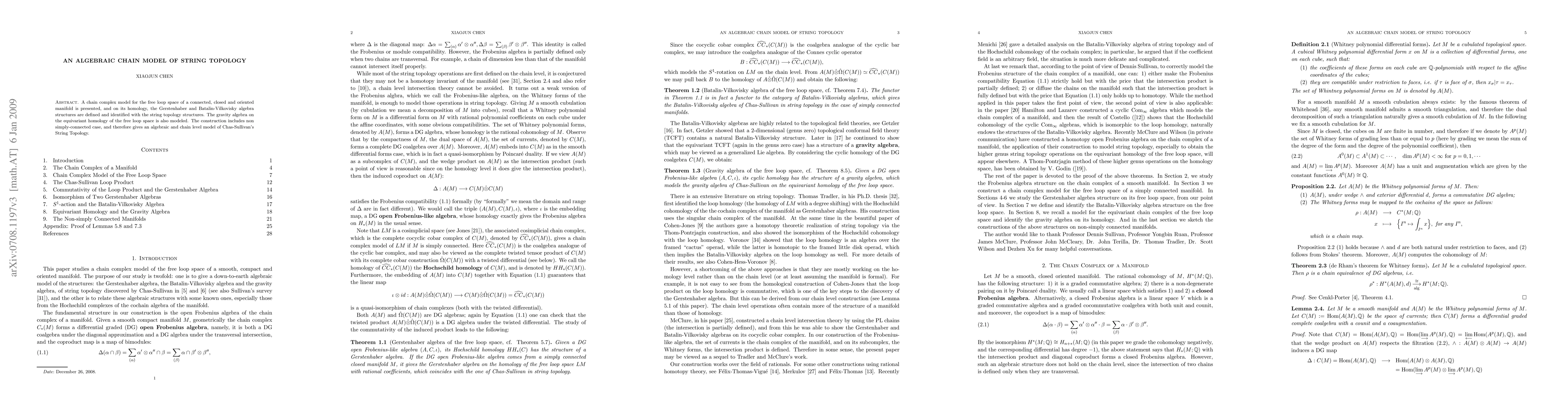 This paper introduces an algebraic chain complex model for the free loop space of a connected, closed, and oriented manifold, defining Gerstenhaber and Batalin-Vilkovisky algebra structures on its homology that correspond to string topology structures. It also models the gravity algebra on the equivariant homology, extending the framework to non-simply-connected cases.