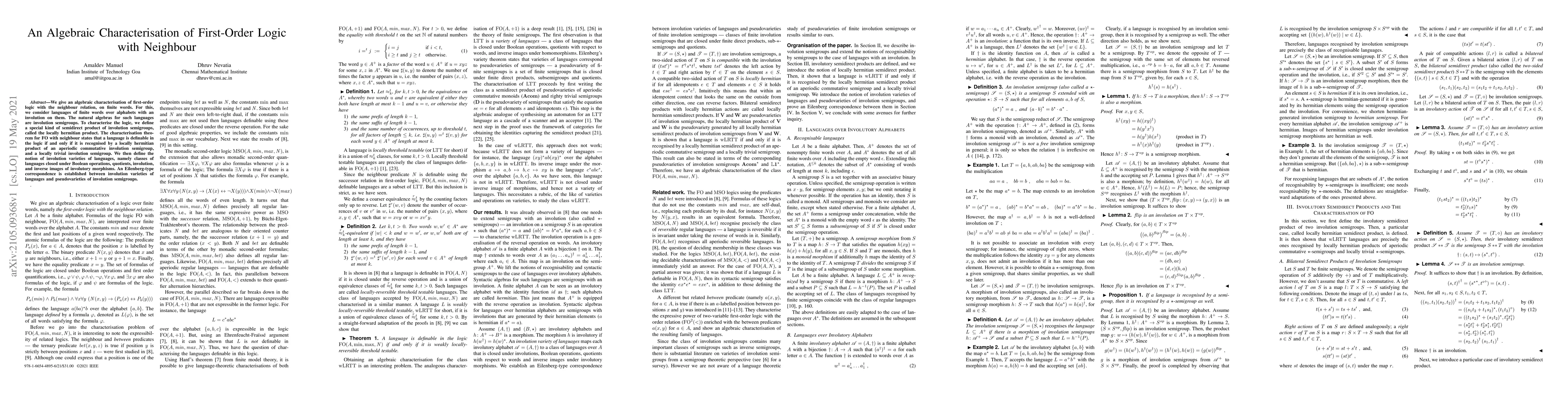 A new algebraic framework characterizes first-order logic with the neighbour relation on finite words, connecting languages to involution semigroups and establishing a correspondence between language varieties and pseudovariety classes.