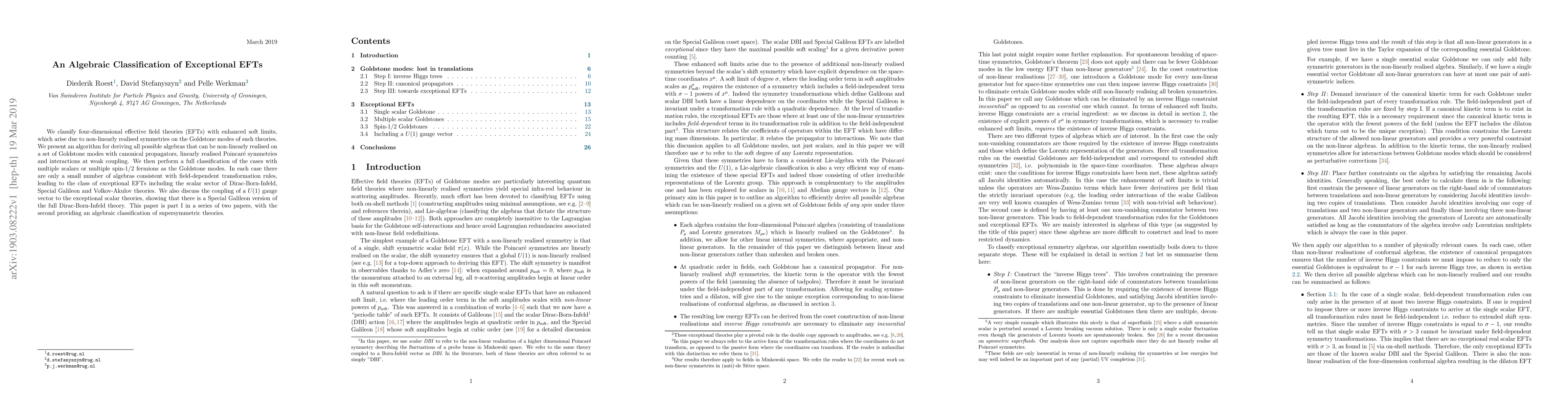 We classify four-dimensional effective field theories (EFTs) with enhanced soft limits, which arise due to non-linearly realised symmetries on the Goldstone modes of such theories. We present an algorithm for deriving all possible algebras that can be non-linearly realised on a set of Goldstone modes with canonical propagators, linearly realised Poincar\'{e} symmetries and interactions at weak coupling. We then perform a full classification of the cases with multiple scalars or multiple spin-$1/2$ fermions as the Goldstone modes. In each case there are only a small number of algebras consistent with field-dependent transformation rules, leading to the class of exceptional EFTs including the scalar sector of Dirac-Born-Infeld, Special Galileon and Volkov-Akulov theories. We also discuss the coupling of a $U(1)$ gauge vector to the exceptional scalar theories, showing that there is a Special Galileon version of the full Dirac-Born-Infeld theory. This paper is part I in a series of two papers, with the second providing an algebraic classification of supersymmetric theories.