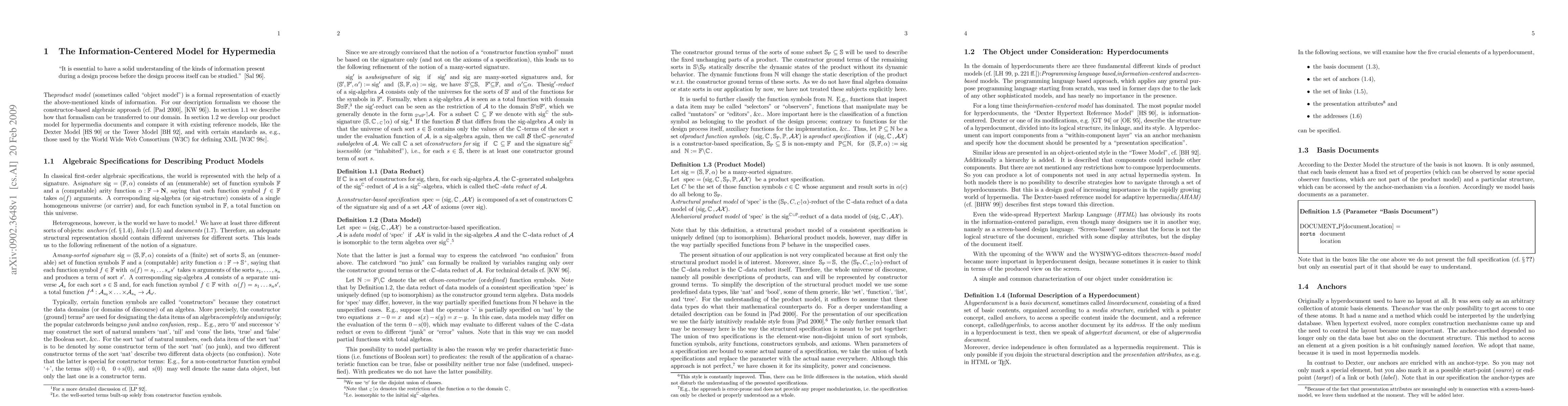 We present the first formal algebraic specification of a hypertext reference model. It is based on the well-known Dexter Hypertext Reference Model and includes modifications with respect to the development of hypertext since the WWW came up. Our hypertext model was developed as a product model with the aim to automatically support the design process and is extended to a model of hypertext-systems in order to be able to describe the state transitions in this process. While the specification should be easy to read for non-experts in algebraic specification, it guarantees a unique understanding and enables a close connection to logic-based development and verification.