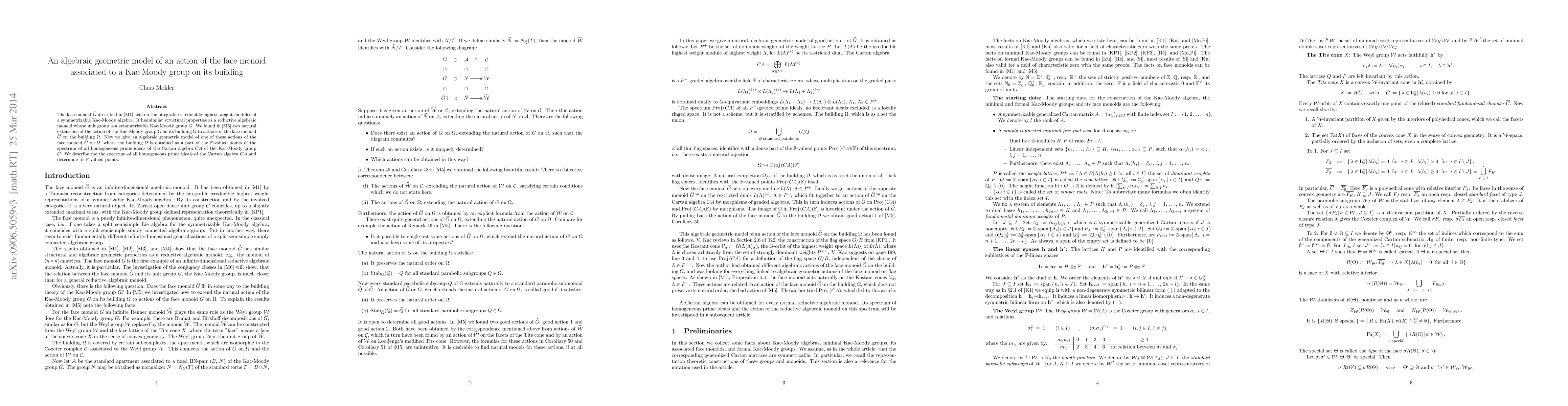 This paper develops an algebraic geometric model of the face monoid's action on a Kac-Moody group's building, describing its full spectrum of homogeneous prime ideals.