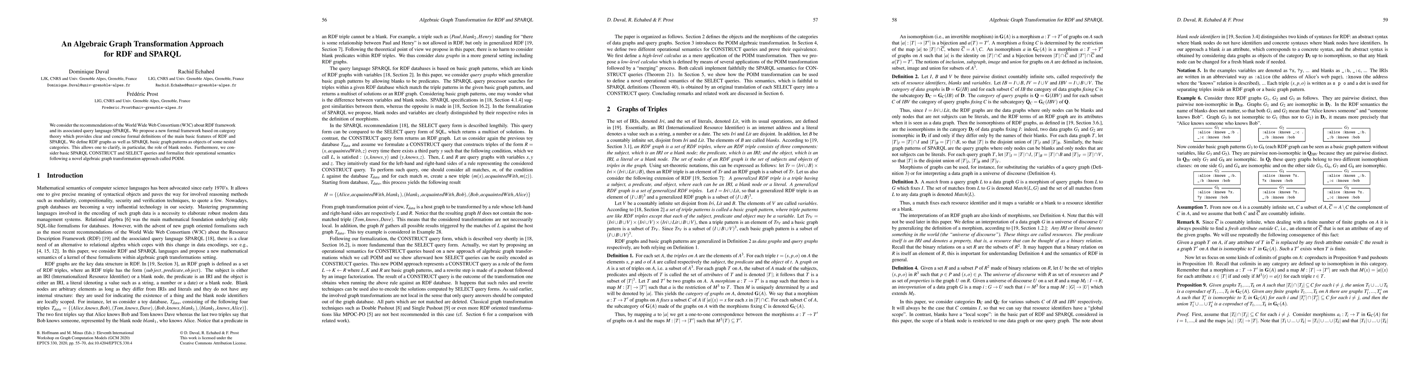 This paper proposes a formal framework using category theory to define RDF and SPARQL, clarifying the role of blank nodes and formalizing SPARQL query semantics via an algebraic graph transformation method called POIM.