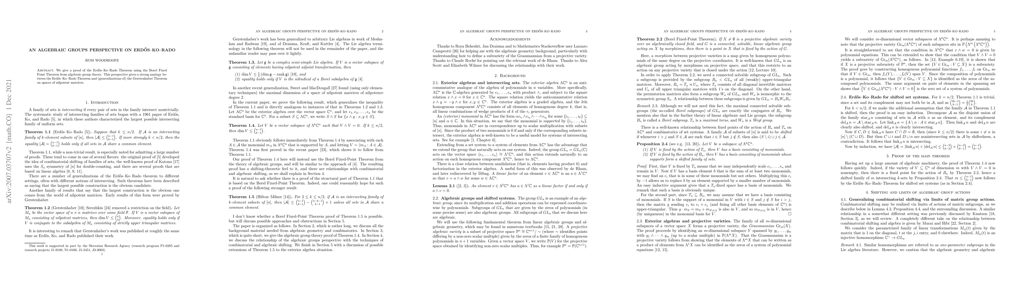 Summary: This paper proves the Erdős-Ko-Rado Theorem via the Borel Fixed Point Theorem from algebraic group theory, drawing a strong analogy between the theorem and Gerstenhaber's Theorem on nilpotent matrices.