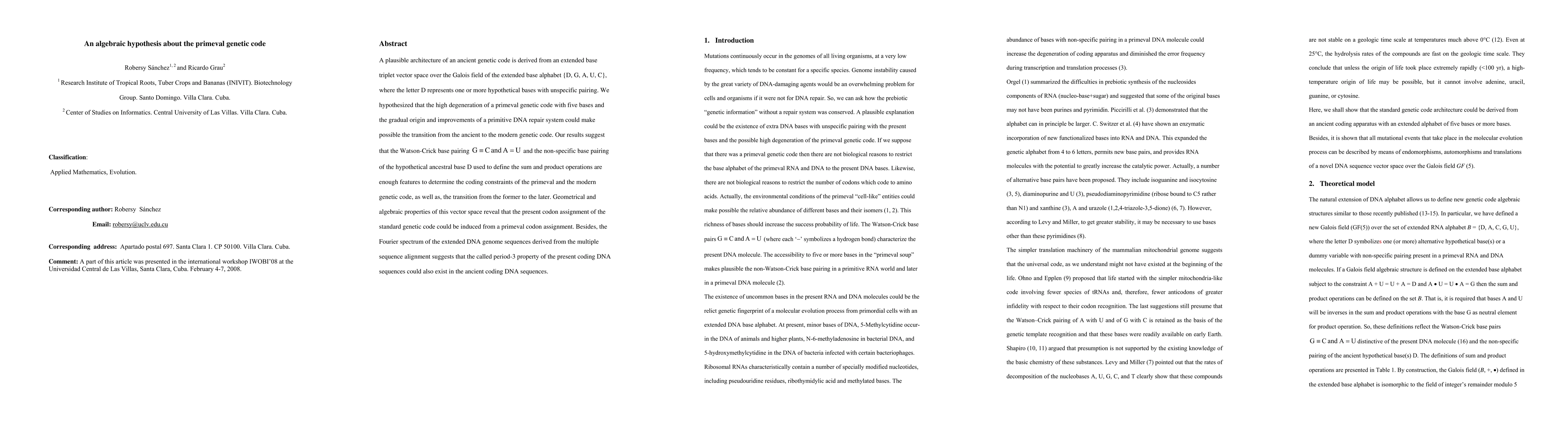 This research proposes an algebraic model of a primeval genetic code using a five-base system, including a hypothetical base D. It suggests that the transition from ancient to modern genetic code could be explained by degeneration and primitive repair system improvements. The study indicates that geometrical and algebraic properties of this vector space could induce present codon assignments, and the period-3 property of coding DNA sequences might have existed in ancient sequences too.