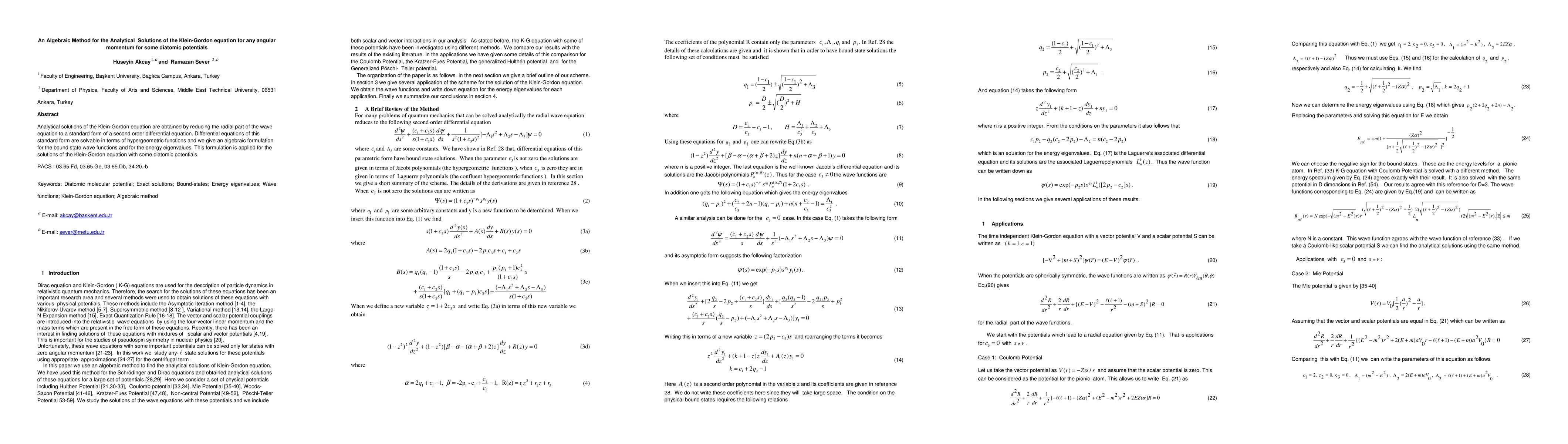 Analytical solutions of the Klein-Gordon equation are obtained by reducing the radial part of the wave equation to a standard form of a second order differential equation. Differential equations of this standard form are solvable in terms of hypergeometric functions and we give an algebraic formulation for the bound state wave functions and for the energy eigenvalues. This formulation is applied for the solutions of the Klein-Gordon equation with some diatomic potentials.
