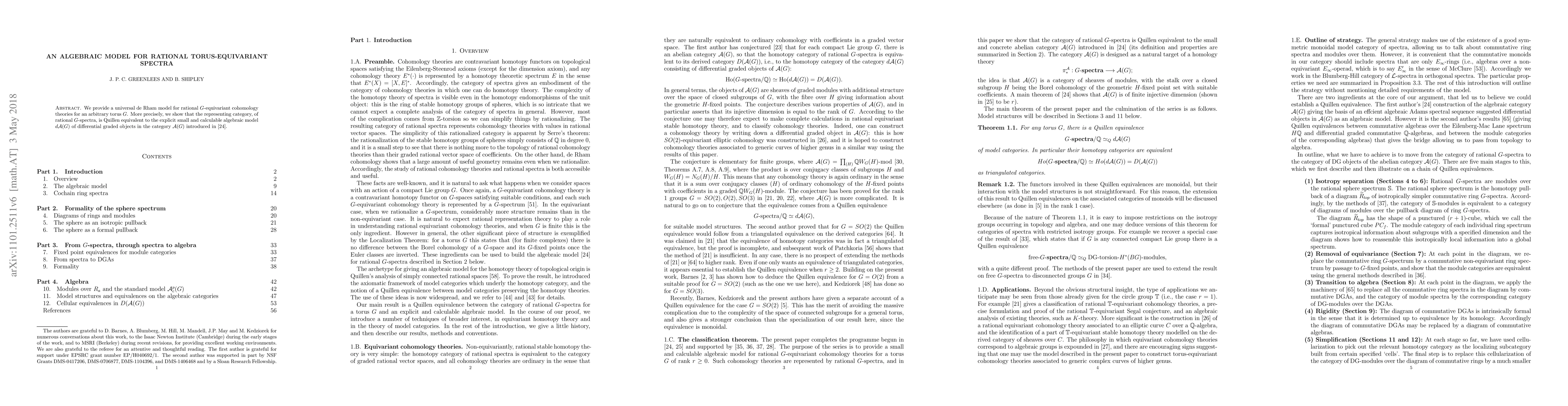 This paper constructs an algebraic model for rational torus-equivariant spectra by showing a Quillen equivalence between rational G-spectra and a practical algebraic model. The process involves several steps including isotropy separation, passage to fixed points, replacing spectra with differential graded algebras, and rigidity, all utilizing cellularization of model categories.