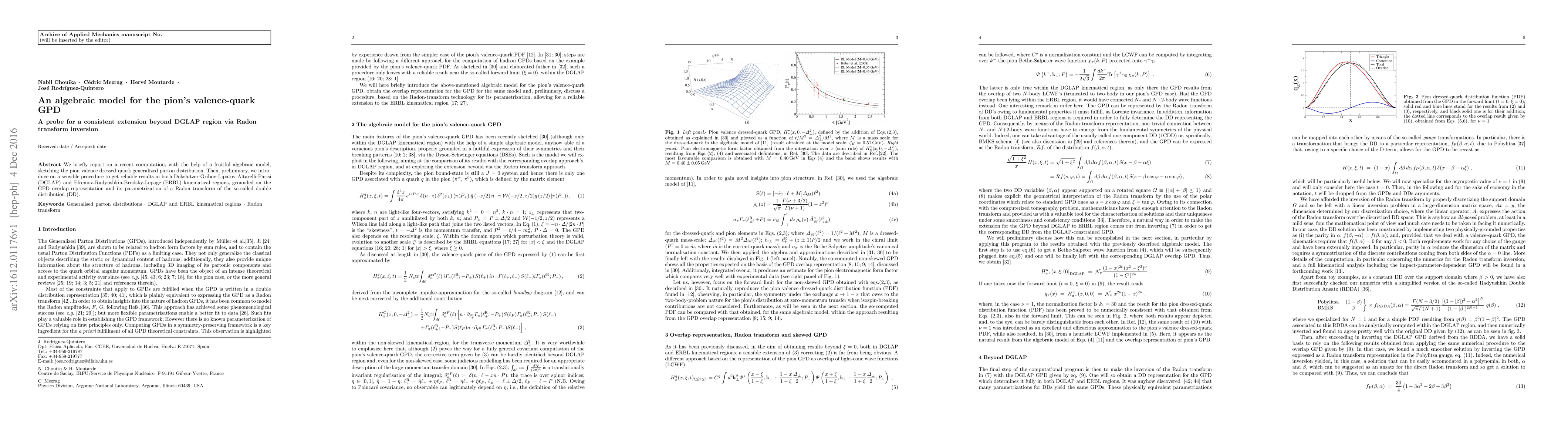We briefly report on a recent computation, with the help of a fruitful algebraic model, sketching the pion valence dressed-quark generalized parton distribution. Then, preliminary, we introduce on a sensible procedure to get reliable results in both Dokshitzer-Gribov-Lipatov-Altarelli-Parisi (DGLAP) and Efremov-Radyushkin-Brodsky-Lepage (ERBL) kinematical regions, grounded on the GPD overlap representation and its parametrization of a Radon transform of the so-called double distribution (DD).
