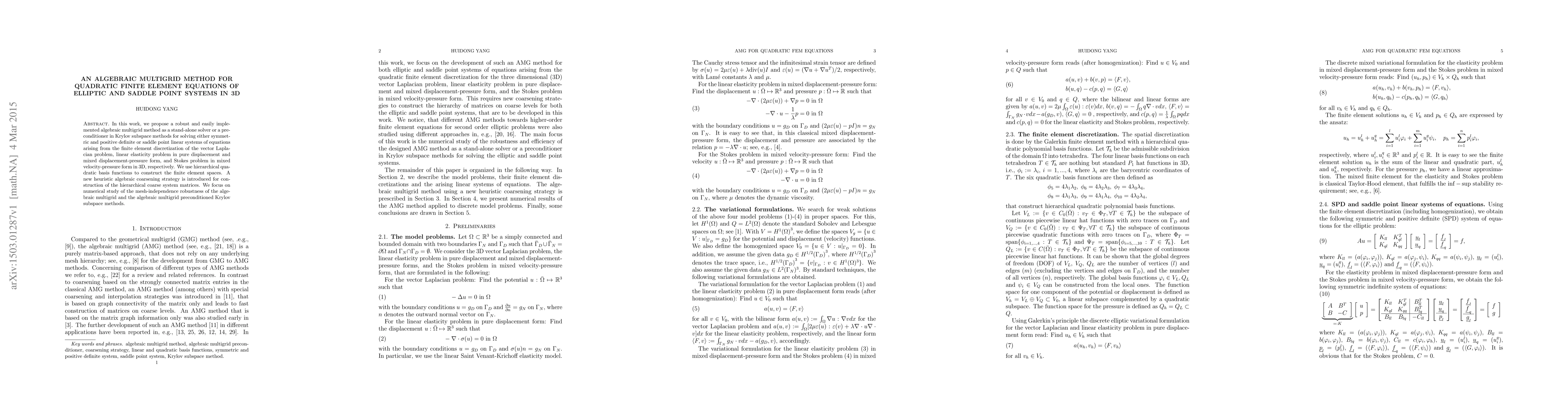 This paper proposes an algebraic multigrid method for solving quadratic finite element equations arising from 3D elliptic and saddle point systems. It introduces a robust, easily implemented method that can serve as a standalone solver or preconditioner, and focuses on the numerical robustness of the method through mesh-independence studies.