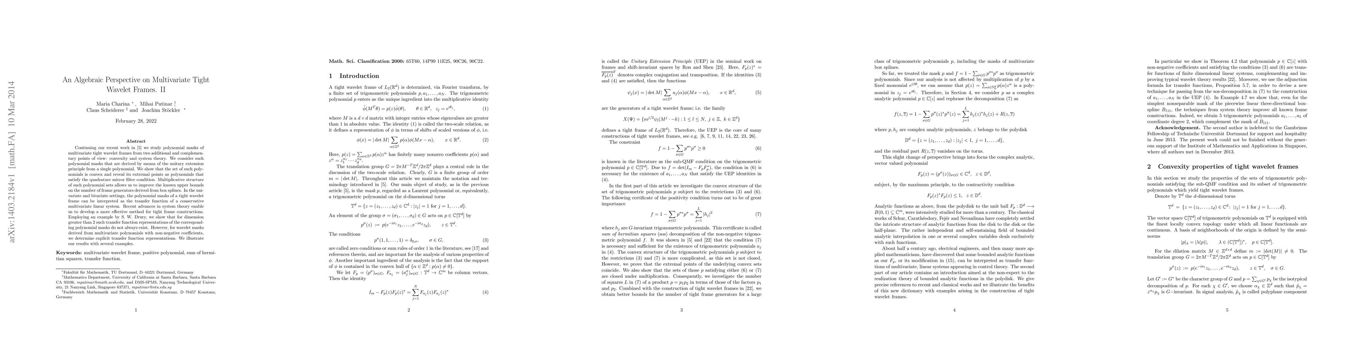 This paper explores multivariate tight wavelet frames through convexity and system theory, showing that the set of polynomial masks derived from a single polynomial is convex and identifying extremal points linked to the quadrature mirror filter condition. It also develops effective methods for constructing tight frames using system theory, though it notes that transfer function representations may not always exist for higher dimensions.
