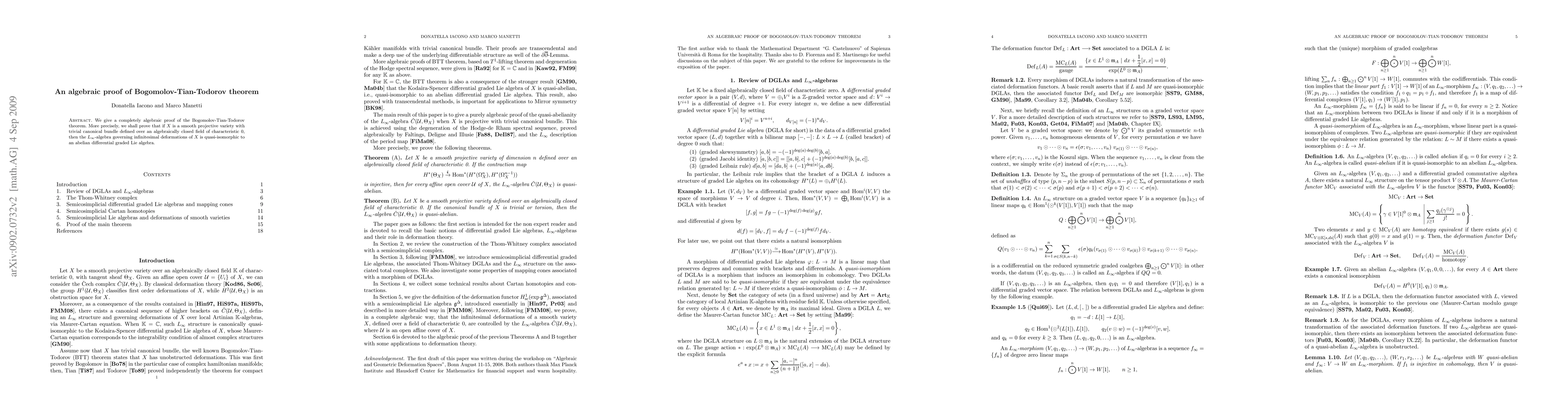 Summary: This paper presents an entirely algebraic proof of the Bogomolov-Tian-Todorov theorem, showing that for smooth projective varieties with trivial canonical bundle over characteristic 0 fields, the L-infinity algebra for infinitesimal deformations is quasi-isomorphic to an abelian differential graded Lie algebra.