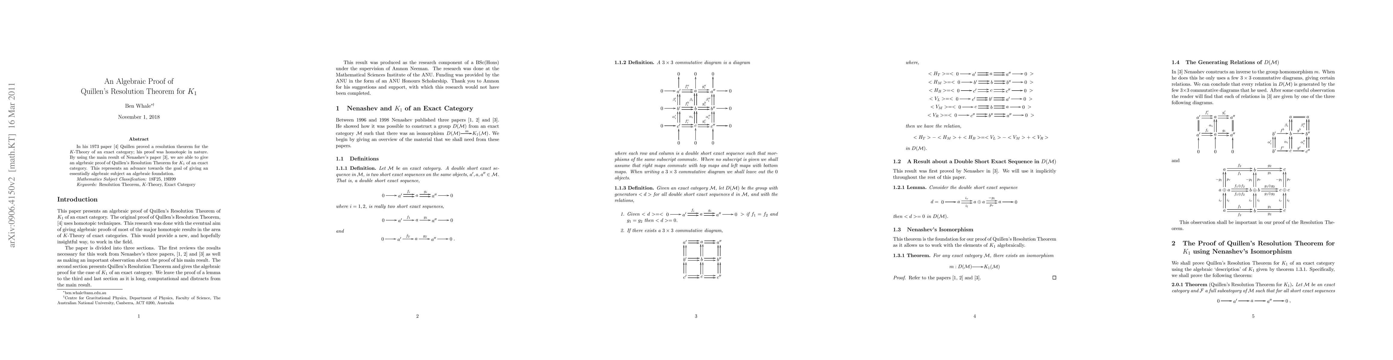 In his 1973 paper Quillen proved a resolution theorem for the K-Theory of an exact category; his proof was homotopic in nature. By using the main result of a paper by Nenashev, we are able to give an algebraic proof of Quillen's Resolution Theorem for K_1 of an exact category.