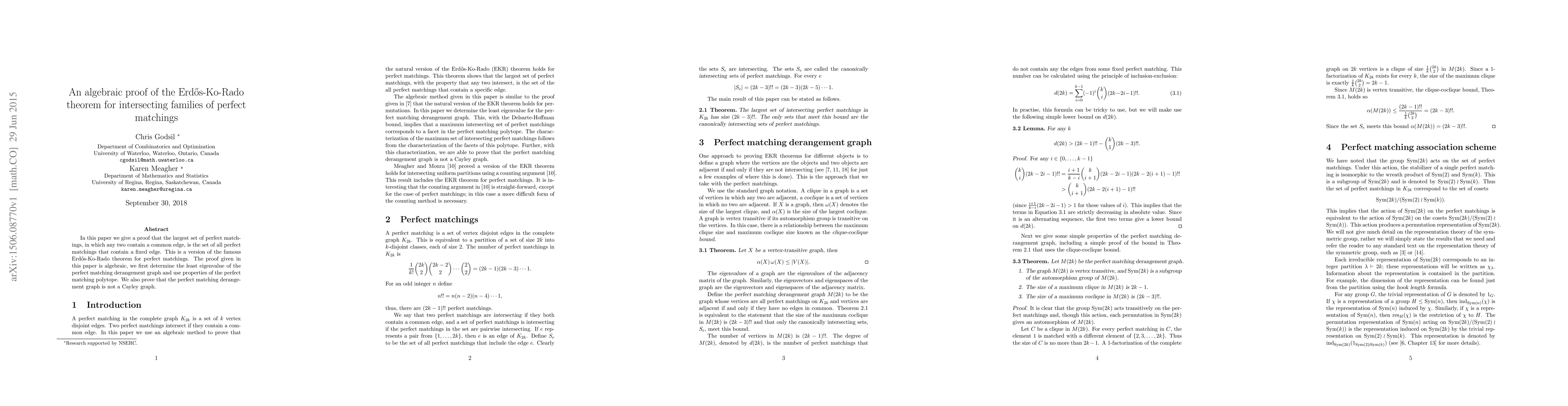 This paper provides an algebraic proof of the Erdős-Ko-Rado theorem for intersecting families of perfect matchings, showing that the largest set of such matchings, where any two share a common edge, consists of all matchings containing a fixed edge. The proof leverages the least eigenvalue of the perfect matching derangement graph and properties of the perfect matching polytope, and it establishes that the derangement graph is not a Cayley graph.