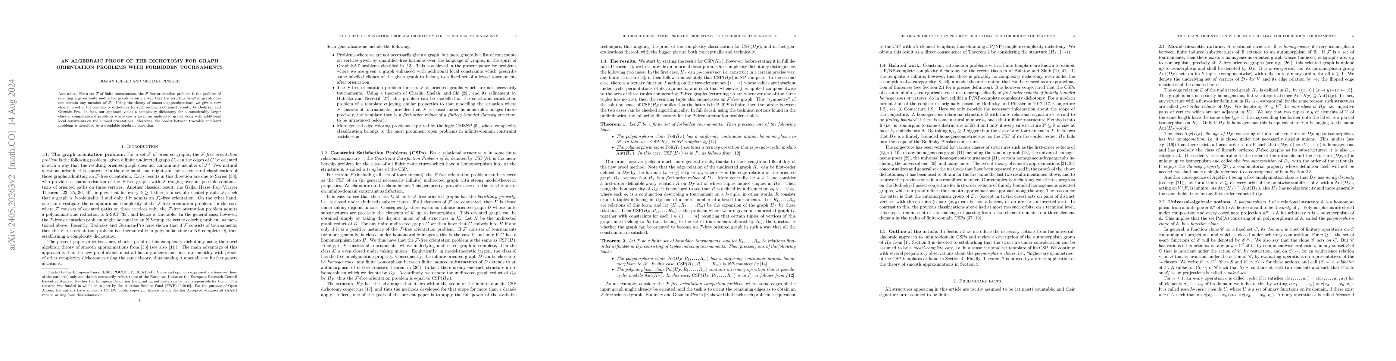 The paper provides an algebraic proof using smooth approximations to establish that the graph orientation problem is either in P or NP-complete when avoiding a set of forbidden tournaments, characterized by specific algebraic conditions.
