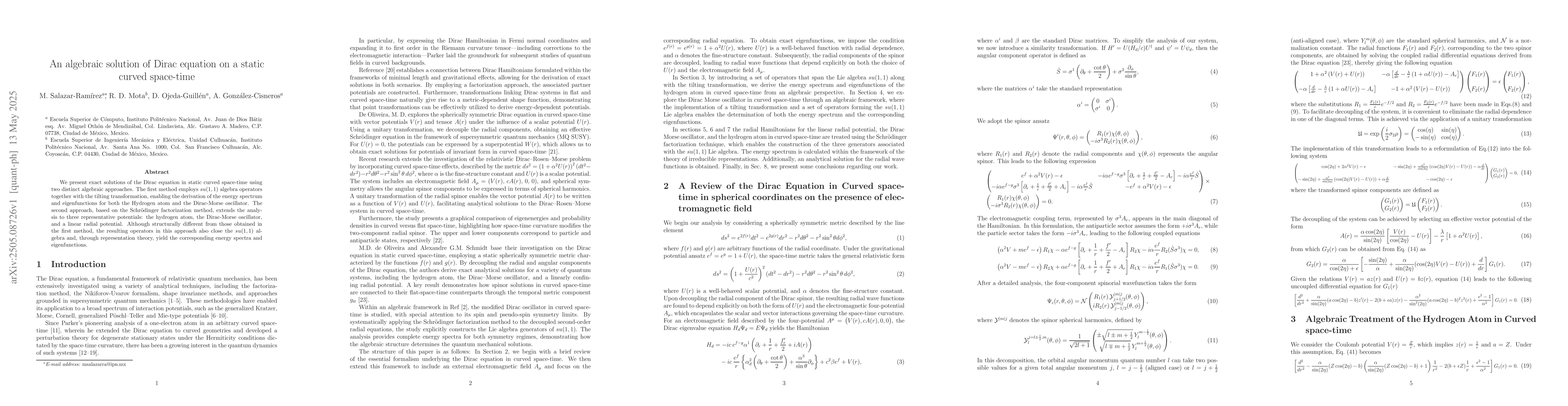The research presents exact solutions of the Dirac equation in static curved space-time using two distinct algebraic approaches: $su(1,1)$ algebra operators with tilting transformation and the Schrödinger factorization method.