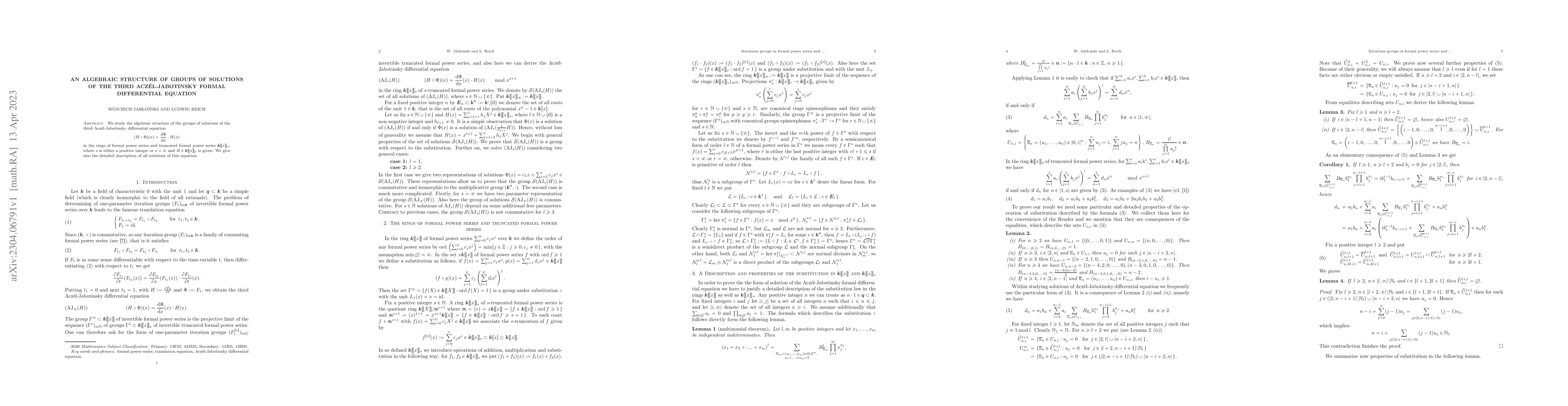 We study the algebraic structure of the groups of solutions of the third Acz{\'e}l-Jabotinsky differential equation $(H\circ \Phi)(x)=\frac{d\Phi}{d x}\cdot H(x)$ in the rings of formal power series and truncated formal power series $k[[x]]_s$, where $s$ is either a positive integer or $s=\infty$ and $H\in k[[x]]_s$ is given. We give also the detailed description of all solutions of this equation.