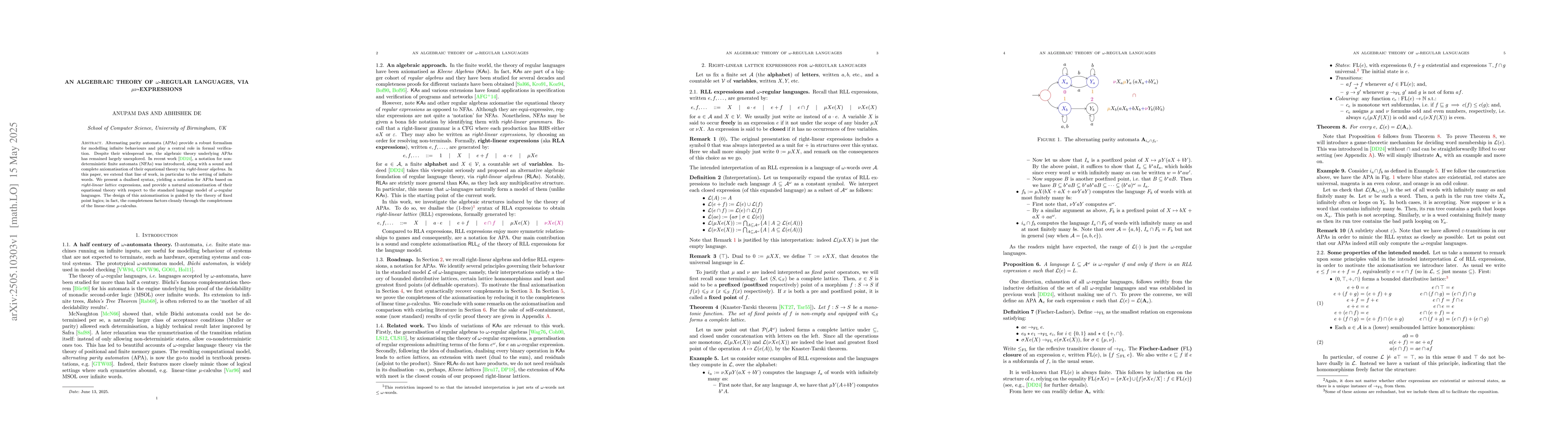 The paper extends the algebraic theory of non-deterministic finite automata (NFAs) to alternating parity automata (APAs) using right-linear lattice expressions, guided by fixed point logics, with completeness linked to the linear-time μ-calculus.