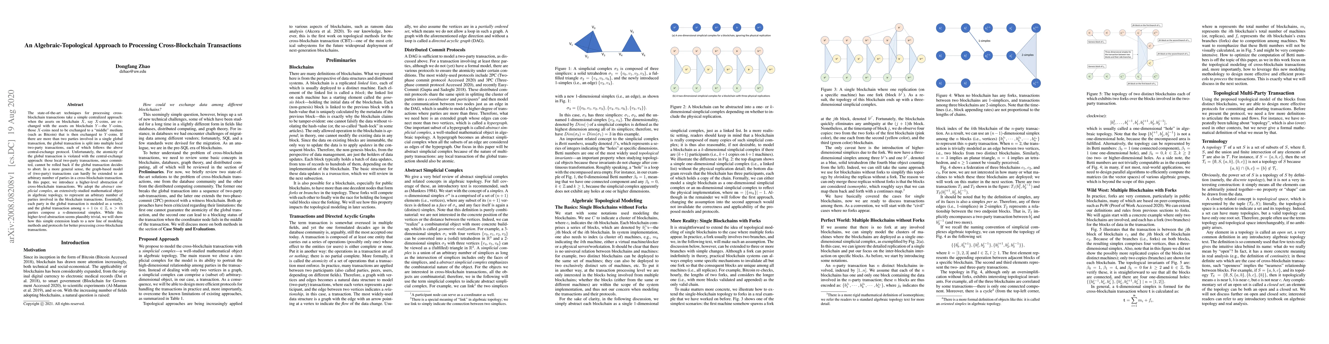 The state-of-the-art techniques for processing cross-blockchain transactions take a simple centralized approach: when the assets on blockchain $X$, say $X$-coins, are exchanged with the assets on blockchain $Y$---the $Y$-coins, those $X$-coins need to be exchanged to a "middle" medium (such as Bitcoin) that is then exchanged to $Y$-coins. If there are more than two parties involved in a single global transaction, the global transaction is split into multiple local two-party transactions, each of which follows the above central-exchange protocol. Unfortunately, the atomicity of the global transaction is violated with the central-exchange approach: those local two-party transactions, once committed, cannot be rolled back if the global transaction decides to abort. In a more general sense, the graph-based model of (two-party) transactions can hardly be extended to an arbitrary number of parties in a cross-blockchain transaction. %from why to how In this paper, we introduce a higher-level abstraction of cross-blockchain transactions. We adopt the \textit{abstract simplicial complex}, an extensively-studied mathematical object in algebraic topology, to represent an arbitrary number of parties involved in the blockchain transactions. Essentially, each party in the global transaction is modeled as a vertex and the global transaction among $n+1$ ($n \in \mathbb{Z}$, $n > 0$) parties compose a $n$-dimensional simplex. While this higher-level abstraction seems plausibly trivial, we will show how this simple extension leads to a new line of modeling methods and protocols for better processing cross-blockchain transactions.
