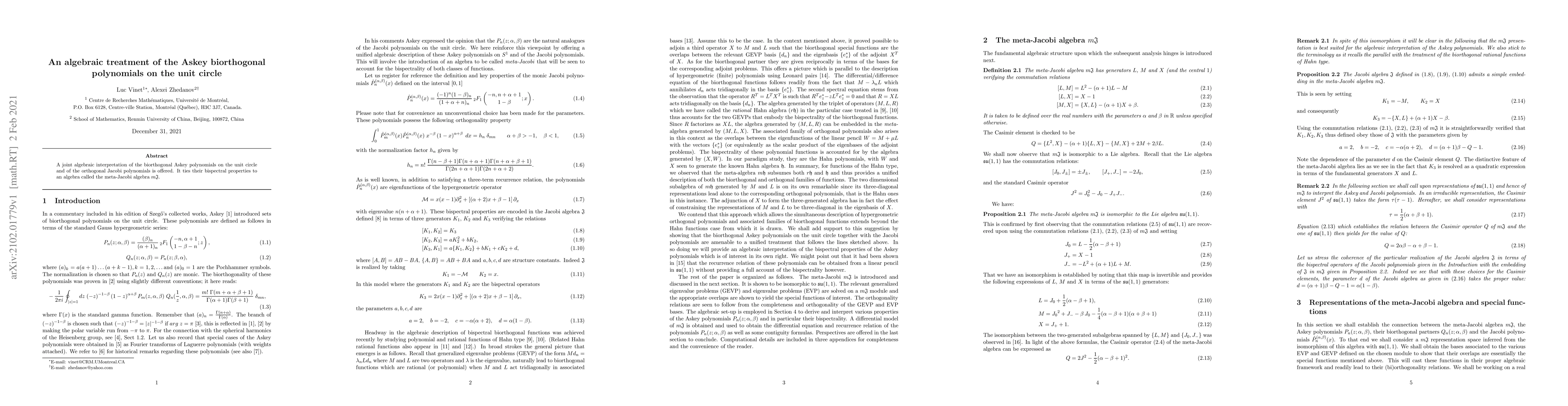A joint algebraic interpretation of the biorthogonal Askey polynomials on the unit circle and of the orthogonal Jacobi polynomials is offered. It ties their bispectral properties to an algebra called the meta-Jacobi algebra $m\mathfrak{J}$.