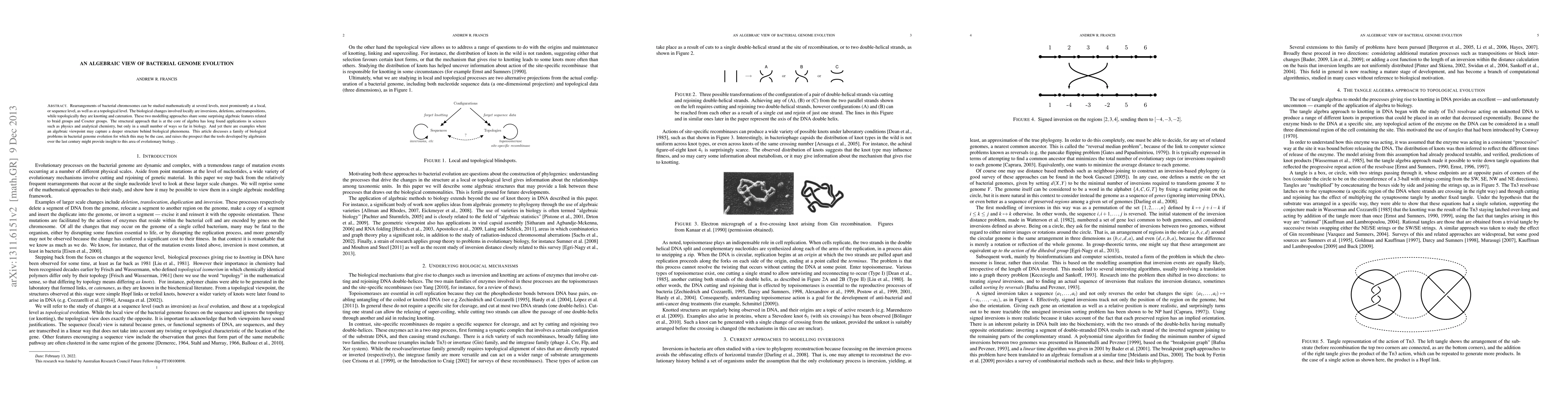 Rearrangements of bacterial chromosomes can be studied mathematically at several levels, most prominently at a local, or sequence level, as well as at a topological level. The biological changes involved locally are inversions, deletions, and transpositions, while topologically they are knotting and catenation. These two modelling approaches share some surprising algebraic features related to braid groups and Coxeter groups. The structural approach that is at the core of algebra has long found applications in sciences such as physics and analytical chemistry, but only in a small number of ways so far in biology. And yet there are examples where an algebraic viewpoint may capture a deeper structure behind biological phenomena. This article discusses a family of biological problems in bacterial genome evolution for which this may be the case, and raises the prospect that the tools developed by algebraists over the last century might provide insight to this area of evolutionary biology. .