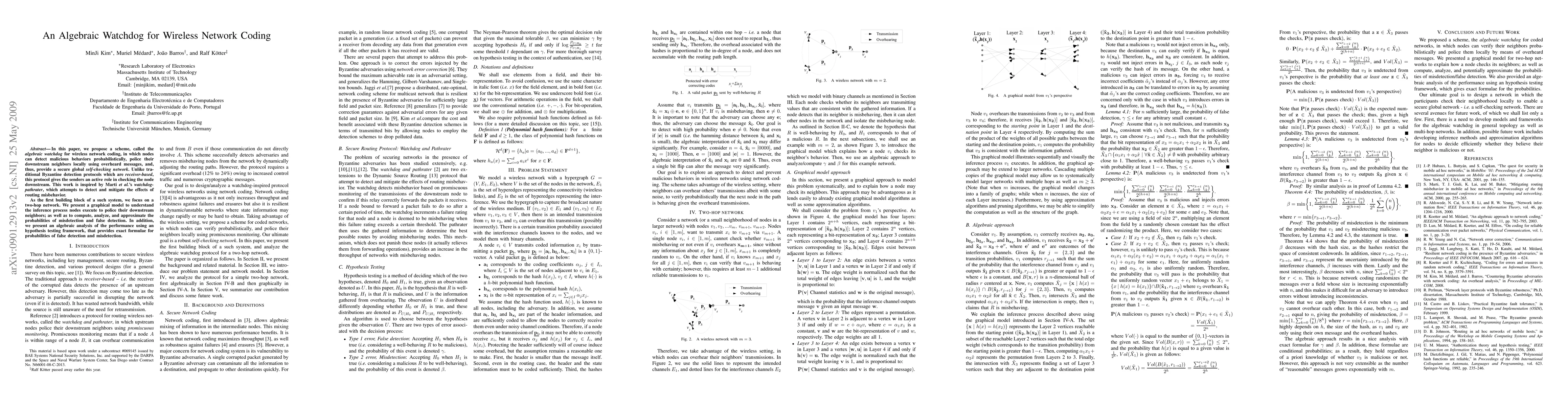 In this paper, we propose a scheme, called the "algebraic watchdog" for wireless network coding, in which nodes can detect malicious behaviors probabilistically, police their downstream neighbors locally using overheard messages, and, thus, provide a secure global "self-checking network". Unlike traditional Byzantine detection protocols which are receiver-based, this protocol gives the senders an active role in checking the node downstream. This work is inspired by Marti et. al.'s watchdog-pathrater, which attempts to detect and mitigate the effects of routing misbehavior. As the first building block of a such system, we focus on a two-hop network. We present a graphical model to understand the inference process nodes execute to police their downstream neighbors; as well as to compute, analyze, and approximate the probabilities of misdetection and false detection. In addition, we present an algebraic analysis of the performance using an hypothesis testing framework, that provides exact formulae for probabilities of false detection and misdetection.
