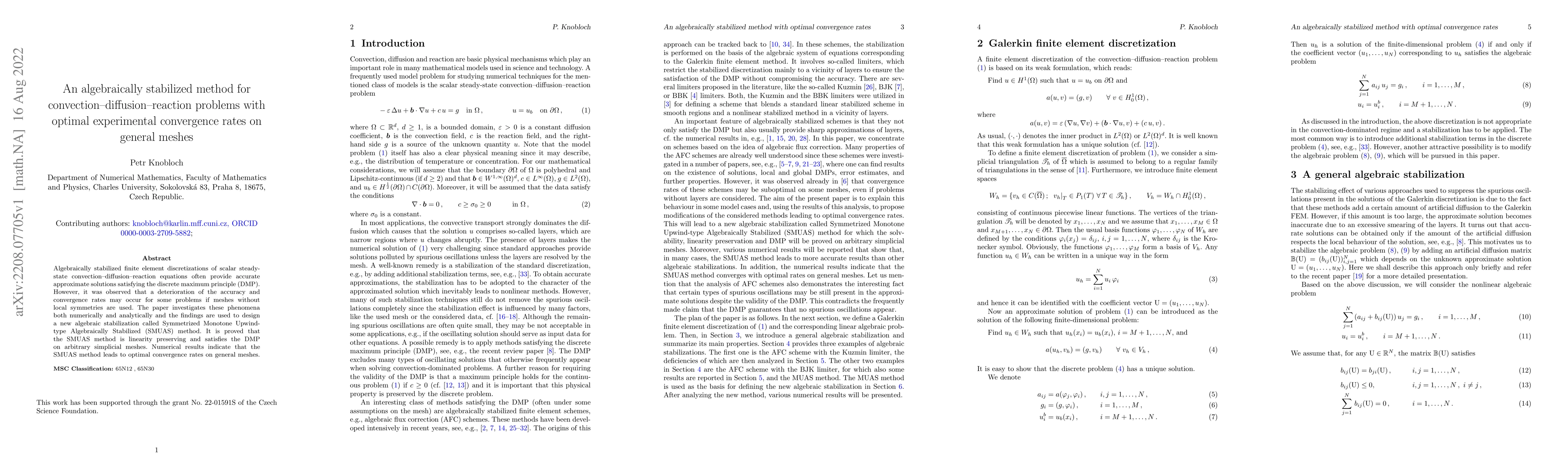 The paper introduces a new algebraically stabilized finite element method, the Symmetrized Monotone Upwind-type Algebraically Stabilized (SMUAS) method, designed to maintain optimal convergence rates and satisfy the discrete maximum principle on general meshes, overcoming issues found in previous methods when used on non-symmetric meshes. The SMUAS method is proven to preserve linearity and achieve optimal convergence.