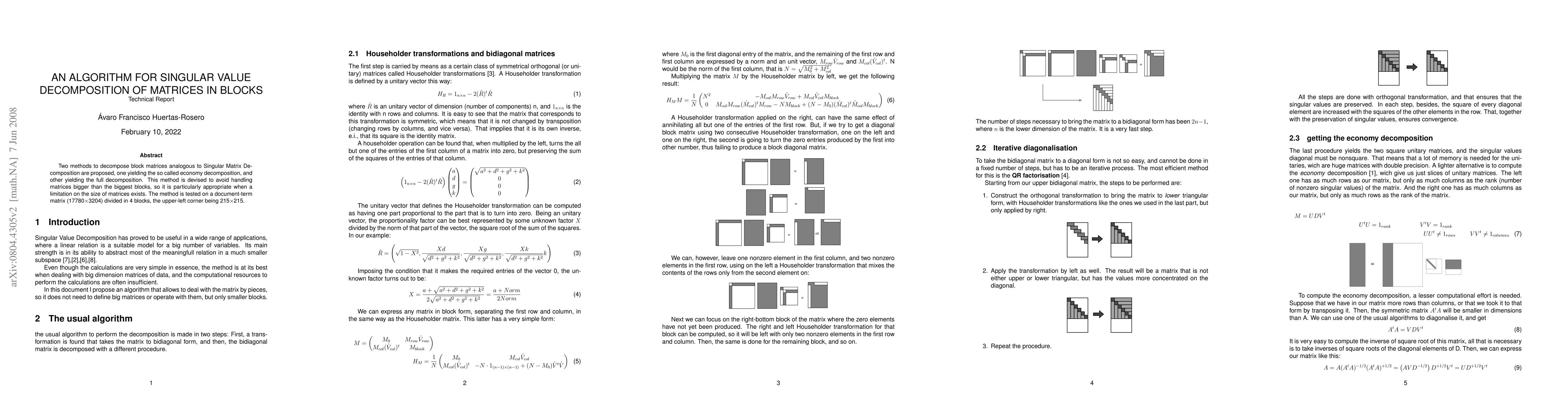 Two methods to decompose block matrices analogous to Singular Matrix Decomposition are proposed, one yielding the so called economy decomposition, and other yielding the full decomposition. This method is devised to avoid handling matrices bigger than the biggest blocks, so it is particularly appropriate when a limitation on the size of matrices exists. The method is tested on a document-term matrix (17780x3204) divided in 4 blocks, the upper-left corner being 215x215.
