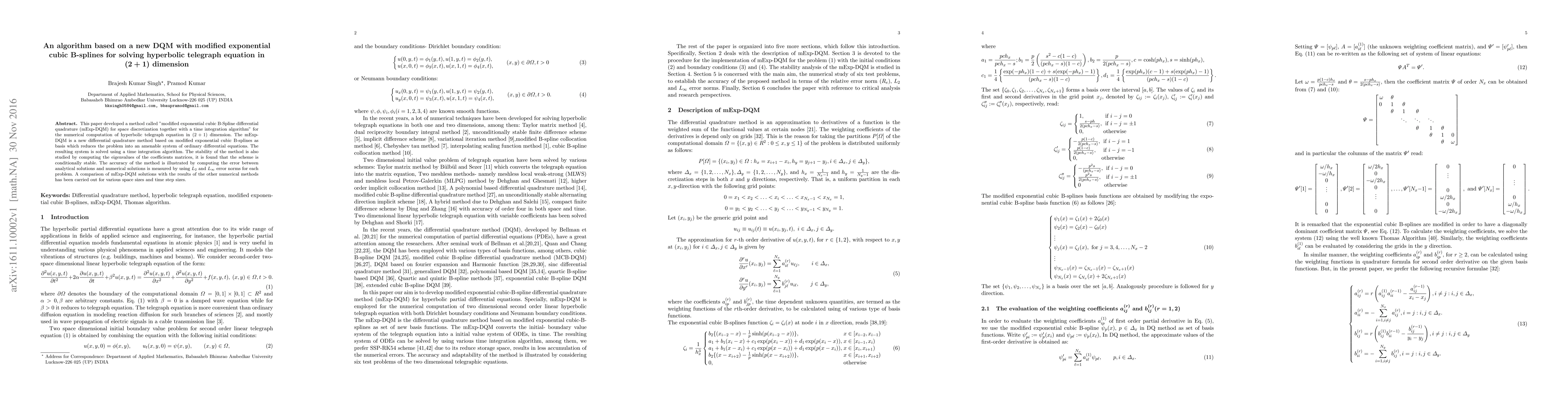 This paper introduces a new numerical method called "modified exponential cubic B-Spline differential quadrature (mExp-DQM)" for solving the hyperbolic telegraph equation in $(2+1)$ dimensions. The method is shown to be conditionally stable and its accuracy is demonstrated through error norm comparisons and comparisons with other numerical methods.
