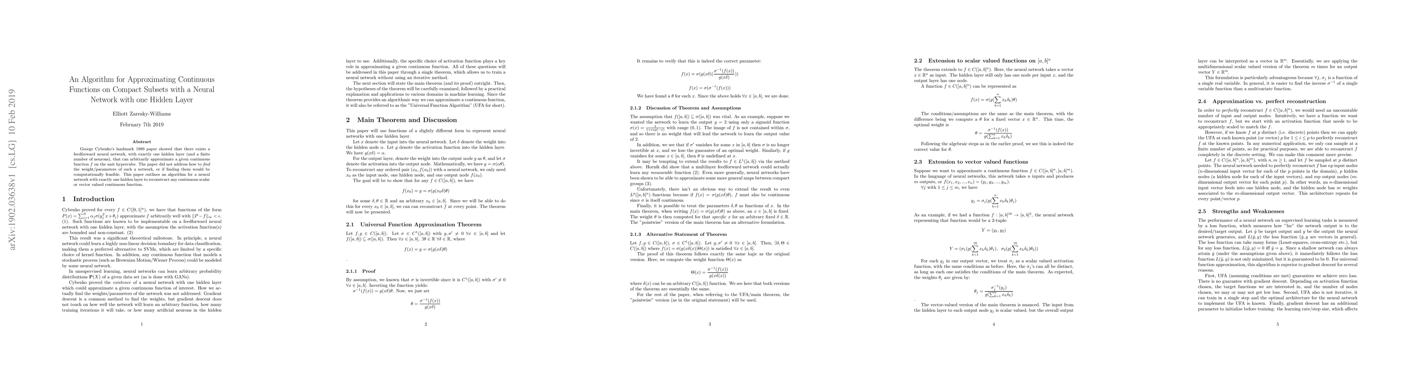 This paper presents an algorithm for training a neural network with a single hidden layer to approximate continuous functions on compact subsets. It builds on Cybenko's foundational work by addressing the computational feasibility of finding the network's weights to achieve such approximations.