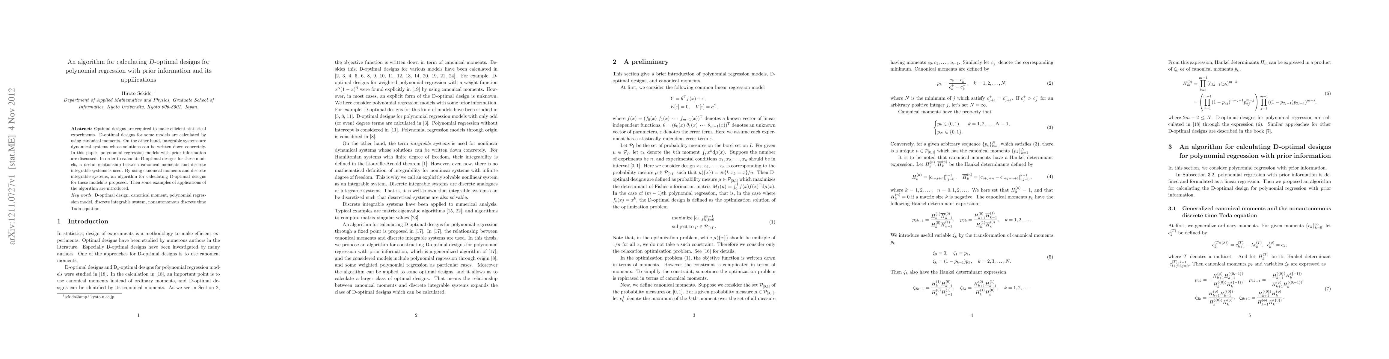 This paper proposes an algorithm for calculating D-optimal designs for polynomial regression models incorporating prior information, leveraging the relationship between canonical moments and discrete integrable systems. Examples of the algorithm's applications are also presented.