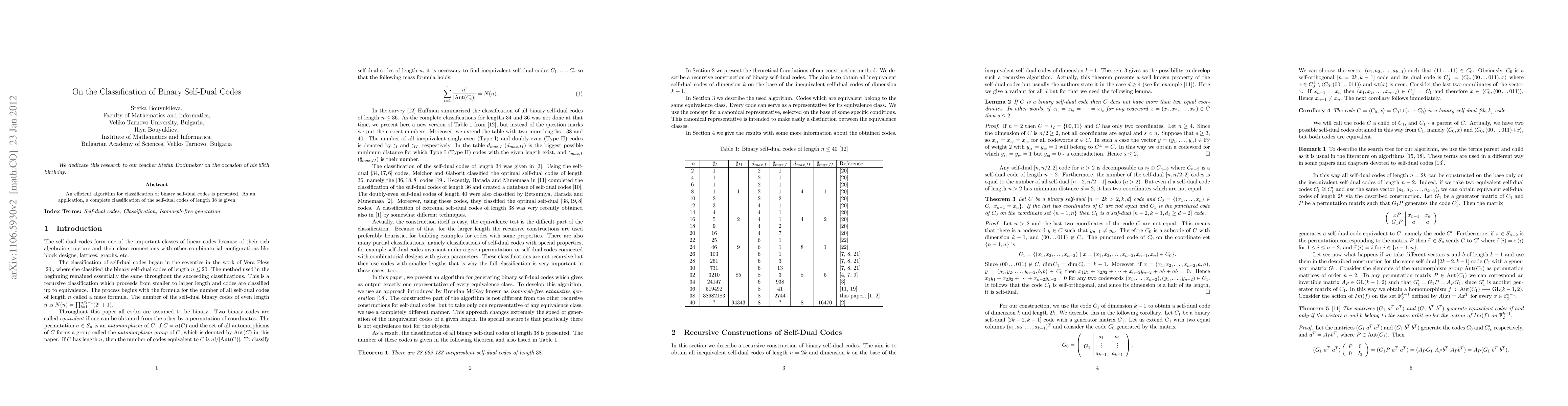 This paper introduces an algorithm for classifying binary self-dual codes, demonstrating its effectiveness through a complete classification of self-dual codes of length 38. The method provides a systematic approach to understanding these codes' structure.