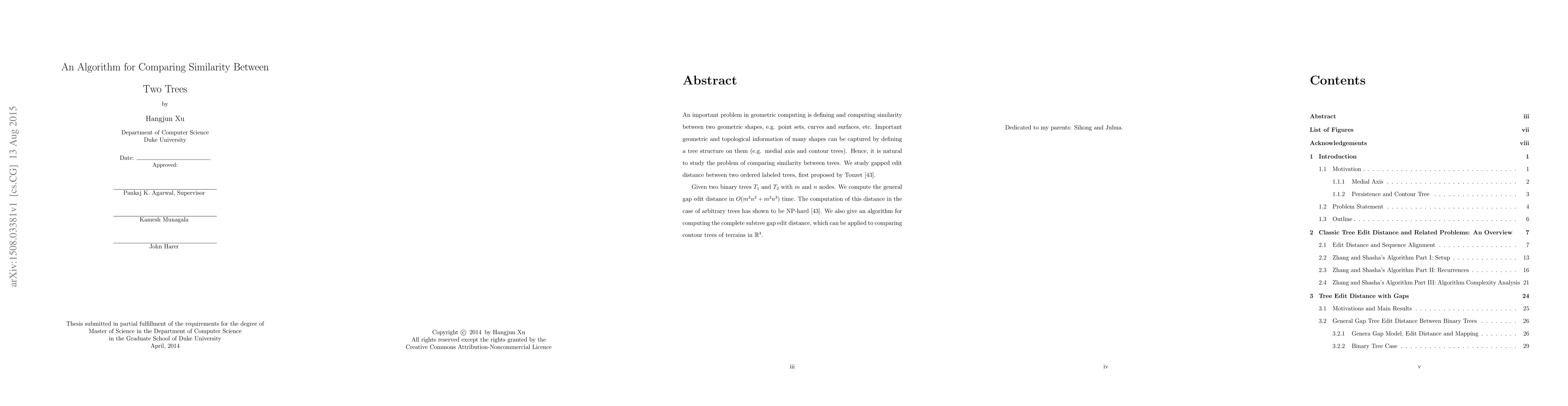 This paper proposes an algorithm to compute the gapped edit distance between two ordered labeled binary trees, achieving a time complexity of $O(m^{3}n^{2} + m^{2}n^{3})$. It also extends the algorithm to handle arbitrary trees and applies it to compare contour trees of terrains in $\mathbb{R}^{3}$.