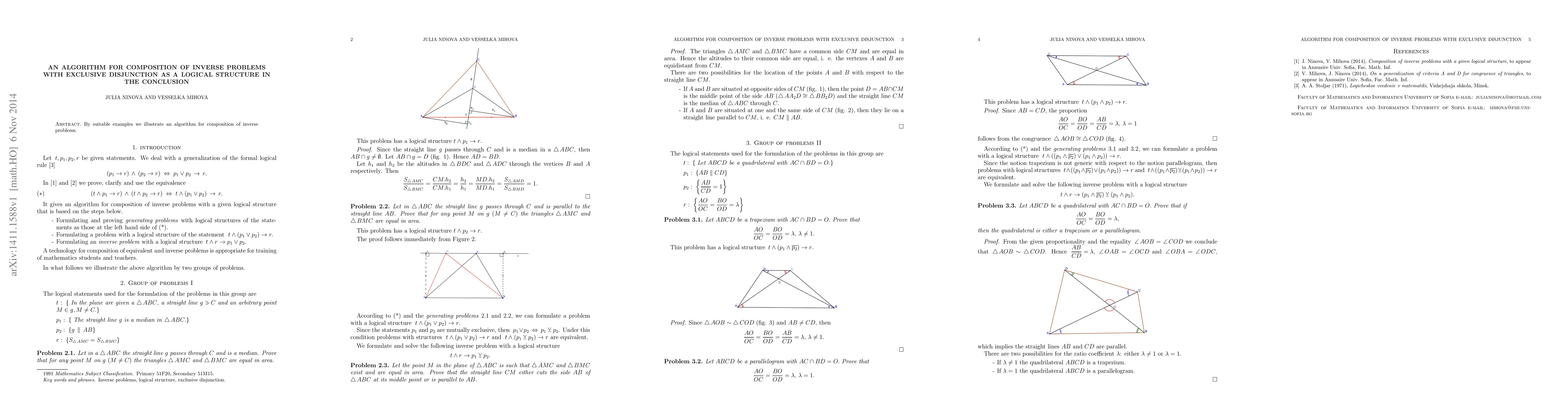 This paper presents an algorithm for combining inverse problems, demonstrated through examples. It emphasizes the use of exclusive disjunction in the conclusion of these composite problems.