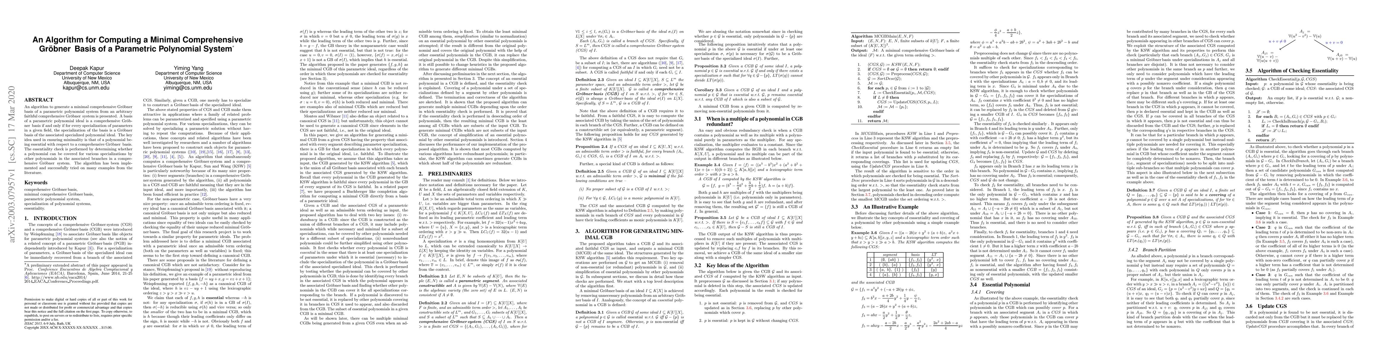 This paper presents an algorithm for generating a minimal comprehensive Gröbner basis for a parametric polynomial system, ensuring that each specialized basis is a Gröbner basis for the corresponding polynomial ideal. The algorithm identifies essential polynomials to maintain minimality and has been successfully tested on various examples.