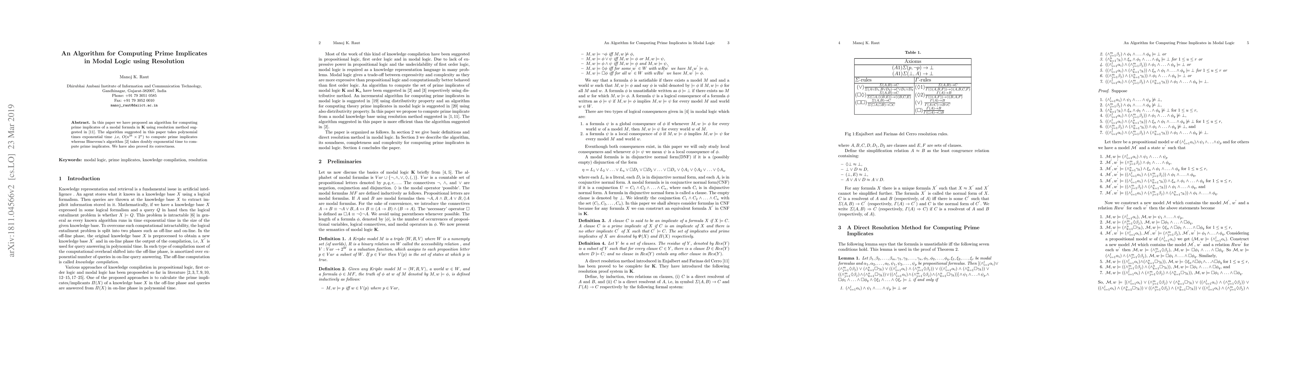 A new algorithm for computing prime implicates in modal logic using resolution method has been proposed, offering a significant improvement over existing methods with an exponential time complexity reduction.