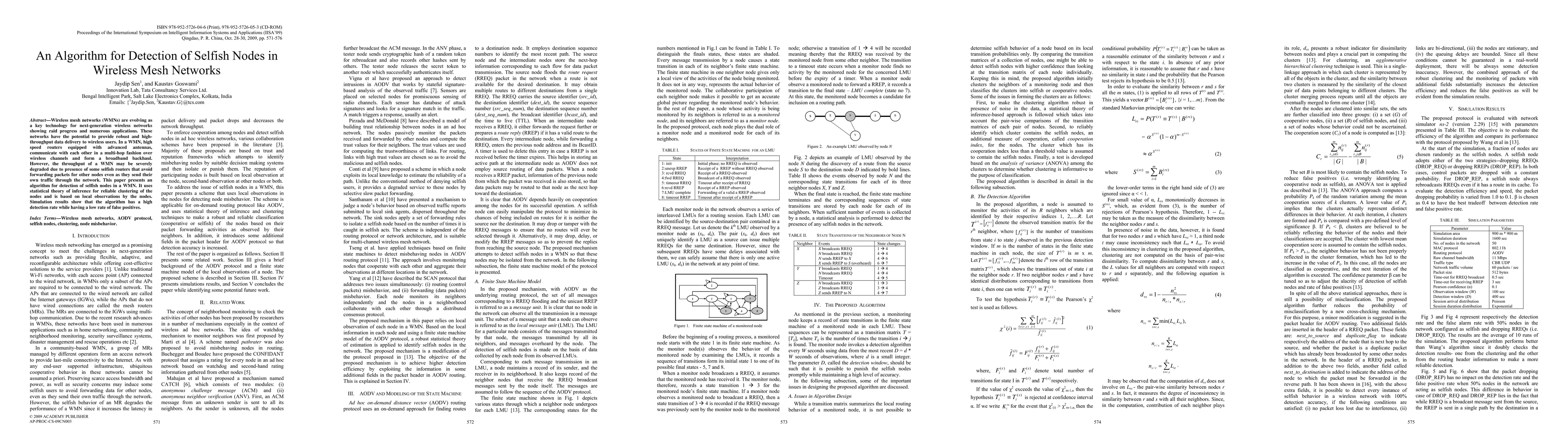 This paper proposes an algorithm for detecting selfish nodes in wireless mesh networks, utilizing statistical inference for reliable clustering based on local node observations. Simulation results indicate a high detection rate with minimal false positives.