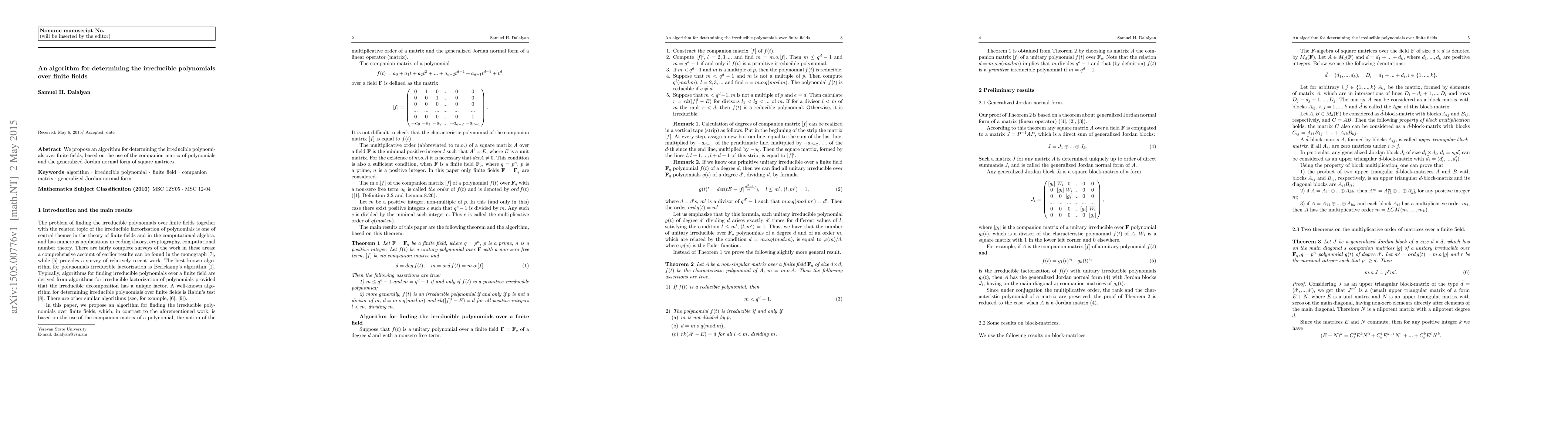 Summary: This paper introduces an algorithm to identify irreducible polynomials over finite fields, leveraging the companion matrix of polynomials and the generalized Jordan normal form of square matrices for efficient computation.