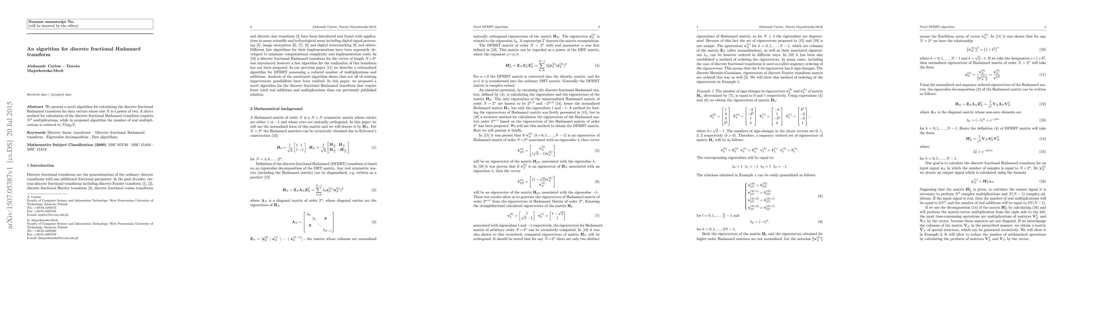 This paper introduces an efficient algorithm for computing the discrete fractional Hadamard transform, reducing the number of real multiplications from $N^2$ to $N \log_2 N$ for data vectors of size $N$ that is a power of two.